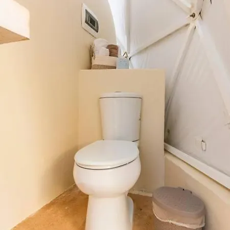Glamping Mayan Glam Hotell har också utsikt över poolen. I badrummet finns en separat toalett, ett badkar och en dusch samt badlakan och handdukar.